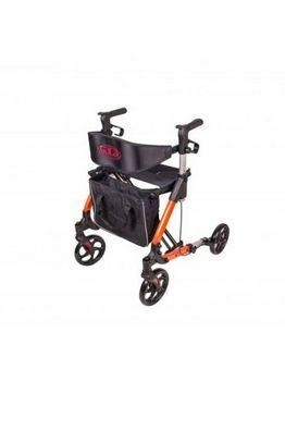 Nowoczesny, składany chodzik czterokołowy aluminiowy. Wyposażony w ergonomiczne uchwyty, wygodne siedzisko z oparciem, torbę na zakupy i odblaski na kołach. Lekki i funkcjonalny.
