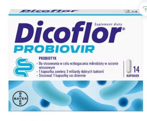 Dicoflor ProbioVir to suplement diety w postaci kapsułek, zawierający żywe kultury bakterii Lactobacillus rhamnosus GG (ATCC 53103) - jeden z najlepiej przebadanych szczepów bakterii kwasu mlekowego, o potwierdzonym w badaniach klinicznych bezpieczeństwie stosowania.