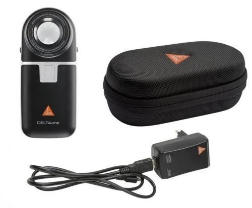 W zestawie: dermatoskop DELTA one (czarno-srebrny) z płytką kontaktową z podziałką, ładowarką E4-USBC i przewodem, w etui.