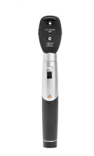 W zestawie; oftalmoskop mini 3000 LED z rękojeścią z bateriami (2xAA), urządzenie w kolorze czarnym.