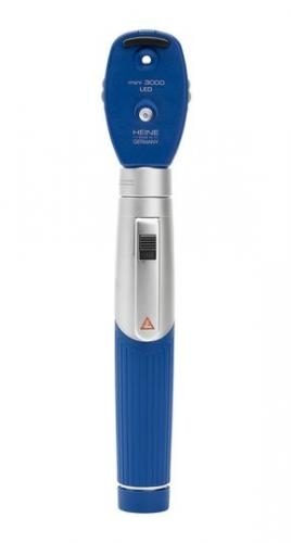 W zestawie; oftalmoskop mini 3000 LED z rękojeścią z bateriami (2xAA), urządzenie w kolorze niebieskim.
