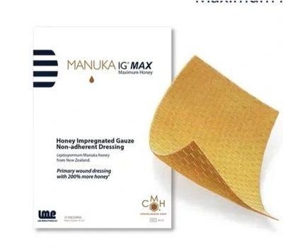 Manuka IG MAX to sterylny, nieprzywierający opatrunek wykonany ze specjalnej siatki o otwartej strukturze nasączony 2x większą ilością medycznego miodu Manuka (Leptospermum scoparium) oznaczony certyfikatem CMH (Certified Manuka Honey).
