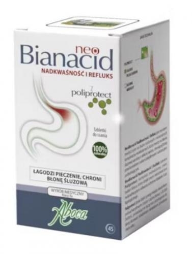 Wyrób medyczny NeoBianacid Nadkwaśność i refluks jest produktem na bazie roślinnych i mineralnych kompleksów molekularnych. Działa ochronnie i łagodząco na błonę śluzową żołądkowo-przełykową. Jest niezastąpiony w przypadku szybkiego łagodzenia pieczenia, bólu, uczucia nadkwaśności, czyli objawów typowych dla podrażnienia i dla zapalenia błony śluzowej.