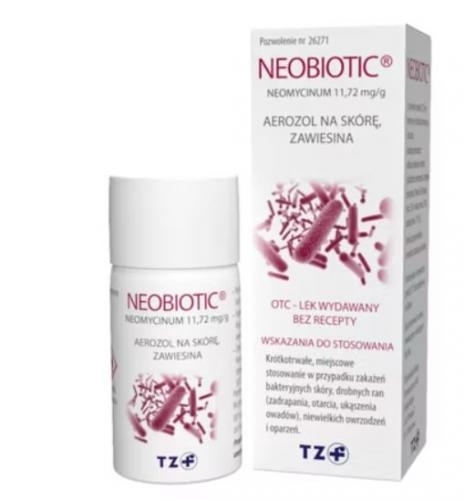 Neobiotic jest lekiem w aerozolu przeznaczonym do krótkotrwałego miejscowego stosowania w przypadku zakażeń bakteryjnych skóry, drobnych ran (zadrapania, otarcia, ukąszenia owadów) niewielkich owrzodzeń i oparzeń. Produkt leczniczy zawiera neomycynę jako substancję czynną, podawany jest na skórę.