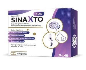 SinaXto Diab to suplement diety dla dorosłych, wspierający układ nerwowy, szczególnie u osób z neuropatiami (np. cukrzycową). Zawiera kwas alfa-liponowy ((300text{ mg})), nukleotydy (urydyna, cytydyna), ekstrakt z magnolii, kwasy omega-3 ((DHA/EPA)) oraz witaminy z grupy B, chrom i selen. Zalecana dawka to 1 kapsułka dziennie podczas posiłku. Działanie: Wspomaga regenerację komórek nerwowych, poprawia funkcjonowanie układu nerwowego, pomaga utrzymać prawidłowy metabolizm (dzięki chromowi) i wspiera funkcje poznawcze.Składniki aktywne:Kwas alfa-liponowy ((ALA)): kluczowy dla ochrony nerwów.Nukleotydy (Monofosforan urydyny i cytydyny): wspomagają odbudowę struktur nerwowych.Witaminy z grupy B ((B_{2},B_{3},B_{5},B_{6},B_{12})), kwas foliowy: wsparcie metabolizmu i układu nerwowego.Ekstrakt z magnolii, algi Schizochytrium (DHA/EPA), chrom, miedź.Wskazania: Uzupełnienie diety osób dorosłych w składniki wspomagające układ nerwowy, szczególnie zalecany dla osób z zaburzeniami czucia (np. w przebiegu cukrzycy).Ostrzeżenia: Nie stosować w przypadku nadwrażliwości na składniki, nie stosować w ciąży i podczas karmienia piersią. SinaXto Diab występuje w opakowaniach po 30 kapsułek.