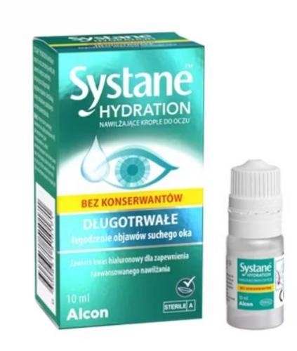 Systane Hydration nawilżające krople do oczu są wskazane do stosowania w terapii zespołu suchego oka, dając czasowe złagodzenie odczuwanych objaów takich jak kłucie, pieczenie i odczucie piasku pod powiekami.