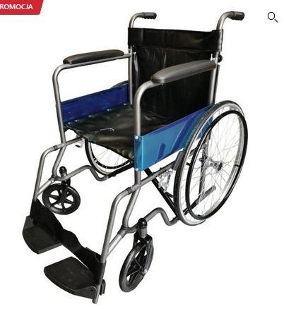 AT52318 to stalowy wózek inwalidzki z tapicerką PVC, szerokim siedziskiem (46 cm) i regulowanymi podnóżkami.